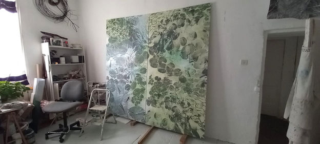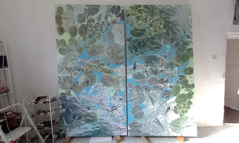 The artworks were created using collaged photographs, specifically reworked digitally, cut up and assembled across the panels. The canvases were built up of many layers, creating a resonating depth and watery feel , and painterly gestures of water based colours (inks, acrylic paints, varnishes) applied in gentle washes and brush strokes, in an ‘aquatic, foliage and flower’ inspired palette. I wanted these colours to be applied in transparent washes, and the collaged material to be subdued and pushed back, softened, with multiple applications.